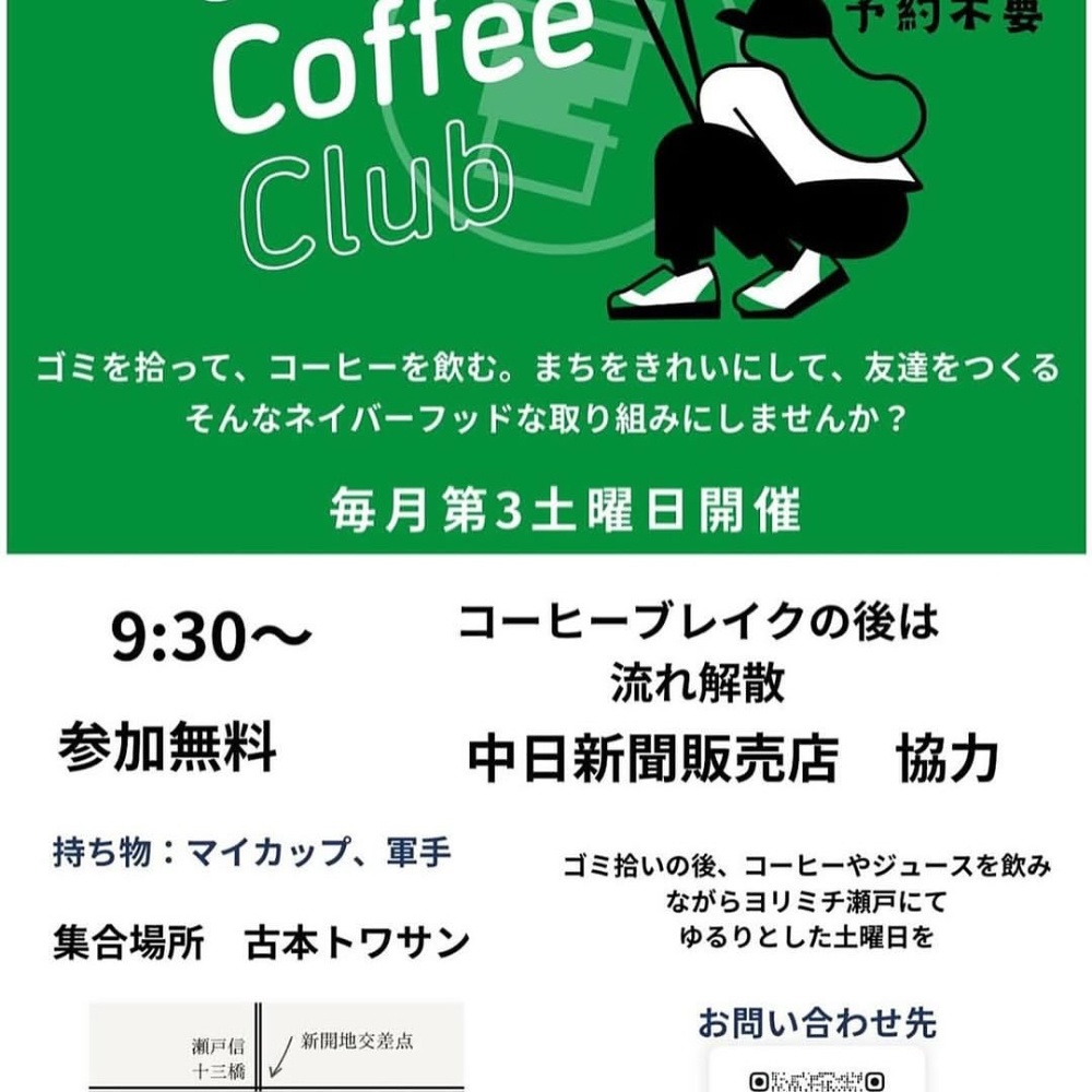 毎月第3土曜日 9:30〜Cleanup & Coffee Club を開催しています。地域をきれいにするゴミ拾いを通じて、ゆるやかなつながりを作る会です。参加は無料で、活動のあとにはコーヒーも無料でご用意しています。どなたでもご参加いただけます。予約は不要ですので、お気軽にお立ち寄りください。